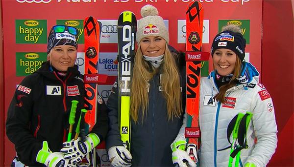 Заключительная гонка у женщин на этапе Кубка мира в канадском Лейк-Луисе – в супергиганте - развивалась по ставшему уже привычным в эти дни сценарию: впереди с большим отрывом «королева скорости» американка Линси Вонн, одержавшая юбилейную – 70-ю победу на этапах Кубка мира, а за ней – молодые австрийские горнолыжницы. На сей раз ими стали Тамара Типплер, выигравшая свой первый в карьере Кубка мира подиум, причём сразу – «серебряный», и новая героиня Лейк-Луиса Корнелия Хюттер, ставшая здесь в третий раз подряд призёром этапа. Обе проиграли Вонн более 1,3 секунды.