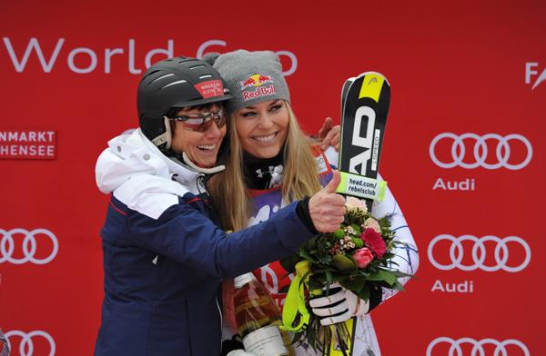 С очередными успехами Вонн поздравила присутствующая на соревнованиях легенда австрийского горнолыжного спорта Аннемари Мозер-Прёлль (на фото), с которой американка теперь делит мировое лидерство по количеству побед в скоростном спуске - у обеих их по 36.