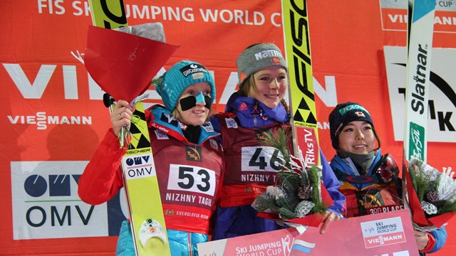 Мороз на нижнетагильском трамплинном комплексе "Аист" сменился обильным снегопадом, что добавило хлопот организаторам, но не помешало Саре Таканаси установить новый рекорд трамплина, побив свой же прежний рекорд 99 метров. Теперь самый дальний прыжок у женщин на трамплине HS100 в Нижнем Тагиле равняется 102, ровно на 2 метра Сара улетела за хиллсайз. К сожалению, неудачный второй прыжок позволил ей занять только третье место.