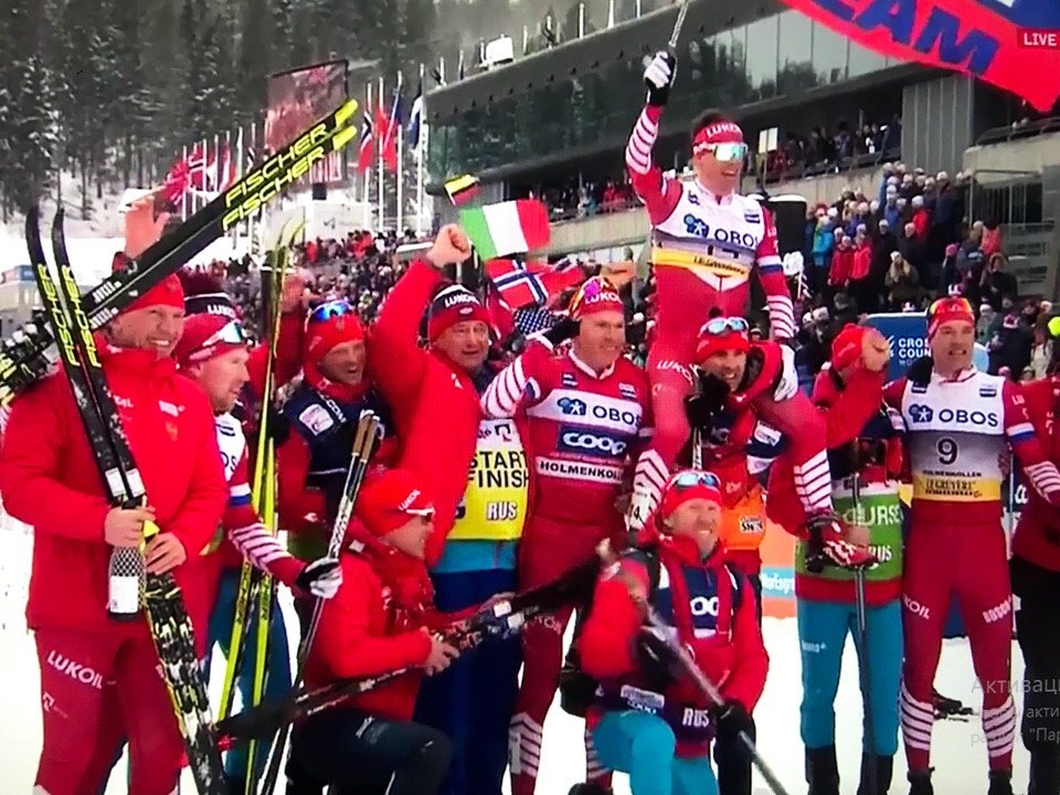 Мужчины состязались в марафоне классическим стилем на 50 км. И завершилась гонка триумфом российских лыжников.